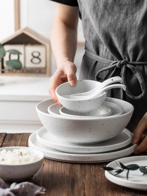 Fabriquée en porcelaine de haute qualité, chaque pièce présente un fini moucheté unique, célébrant la beauté des imperfections.